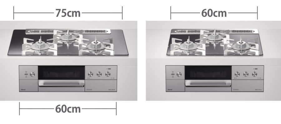 ビルトインコンロの場合はトッププレート(天板)が60cmと75cmタイプがあります。キッチンスペースに合わせたサイズを選びましょう。本体部分は60cmで統一されているためどちらのタイプでも取替が可能です。