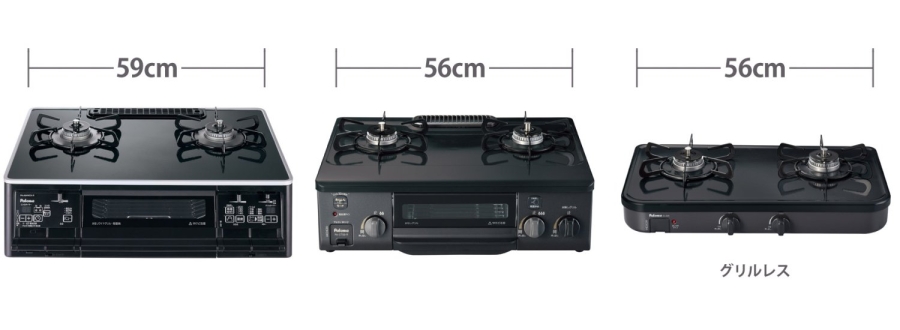 横幅が約56cmのコンパクトタイプやグリルレスタイプのコンロもありますよ。