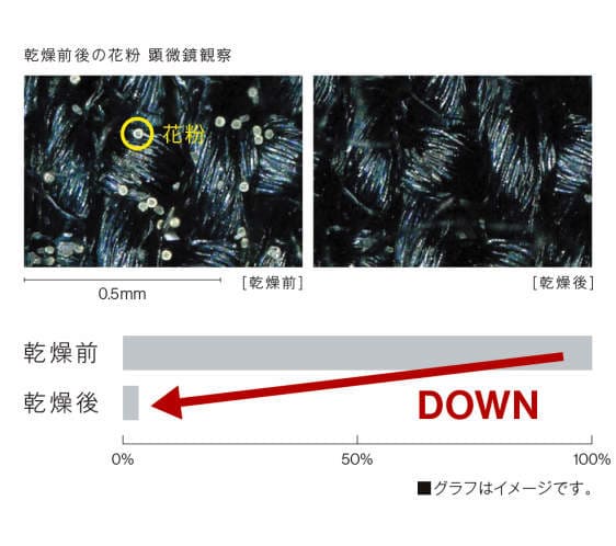 (■試験製品:リンナイ ガス衣類乾燥機 乾太くんRDT-54S-SV ■乾燥時間:20分運転(タイマー) ■ 衣類生地:綿Yシャツ、混紡(綿35% 化繊 65%)Yシャツ ■衣類量:3kg ■乾燥度:100% ■試験方法:①5cm×5cmのYシャツ生地に1mgのスギ花粉をまぶし、袋に入れて花粉を拡散させる。②Yシャツ前面に生地を縫い付け、その他衣類と一緒に乾燥。 ■試験結果:花粉中のアレル物質量の測定結果 約99%減少 ■アレル物質は花粉に含まれるたんぱく質です。 リンナイ(株)調べ(公益財団法人 名古屋産業科学研究所協力))