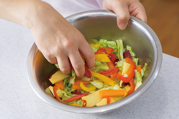 ② ボウルに①を入れ、塩、コショウ、オリーブオイルを加え、全体をよく絡めてからアルミホイルで包みます。