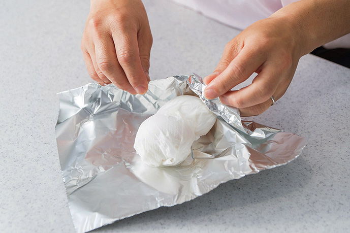 ③ 卵を十分に水で濡らしたキッチンペーパーで包み、さらにその上からアルミホイルで包みます。