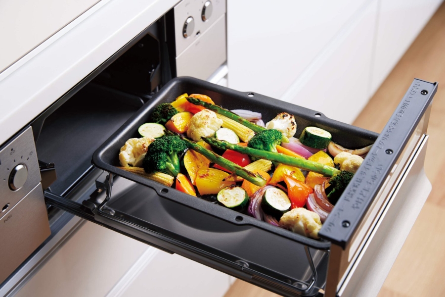 - スクエアなデザインで容量もアップし、大きな食材でも調理可能。グリル庫内への油はねを99.9%カットし、お手入れも簡単です。